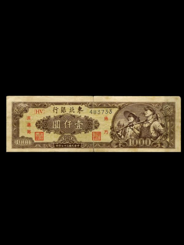 正面:棕色;票面上方为行名及票号;右部为工人和农民图案;左部为面额“壹仟圆”及“总经理章”、“经理之章”方印以及其两端的“地方”、“流通券”字样;四角印有面额“壹仟”、“1000”字样;下方为印制时间“中华民国三十七年印”字样。背面棕色,英文字样,上方为行名;中部为东北银行大楼图案;左右印有面额“1000”;下部印有英文面额及印制时间“1948”。