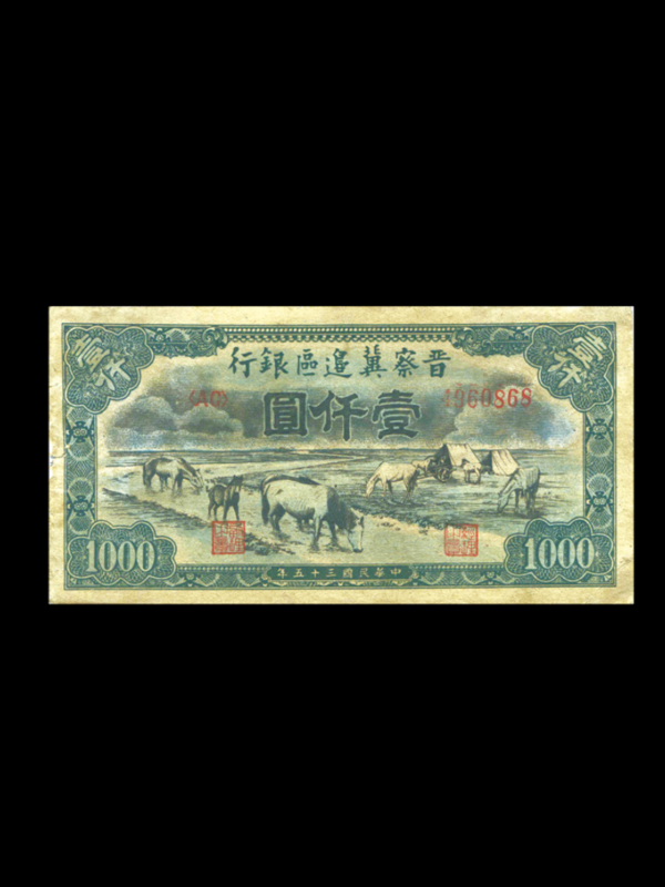 正面:蓝色;票面上方为行名、票号及面额“壹仟圆”;中部为牧马图案,下方为经理之章、副理之章的方印及印制时间“中华民国三十五年”字样;四角印有面额“1000”及“壹仟”。背面棕色,英文字样,上方为行名,中部印着写有“大好河山”的城门图案;中下及两端印有英文面额及数字面额“1000”,最下端为印制时间“1946”。