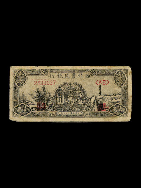 西北农民银行创建于1940年5月,由晋绥边区政府领导。1948年1月,晋绥边区与陕甘宁边区统一为西北解放区,该行与陕甘宁边区银行合并为新的西北农民银行,是日后成立的中国人民银行的前身之一。正面:黑色;票面上方为行名及票号;中部为面额“壹萬圆”及经理之章、副理之章的方印,背景为宝塔山图案;四角印有面额“壹萬”字样;面额下方印制时间“中华民国三十七年”字样。背面红色,英文字样,上方为行名,左右及四角印有面额“1000”,中部为北京天坛图案,最下方为印制时间“1948”。