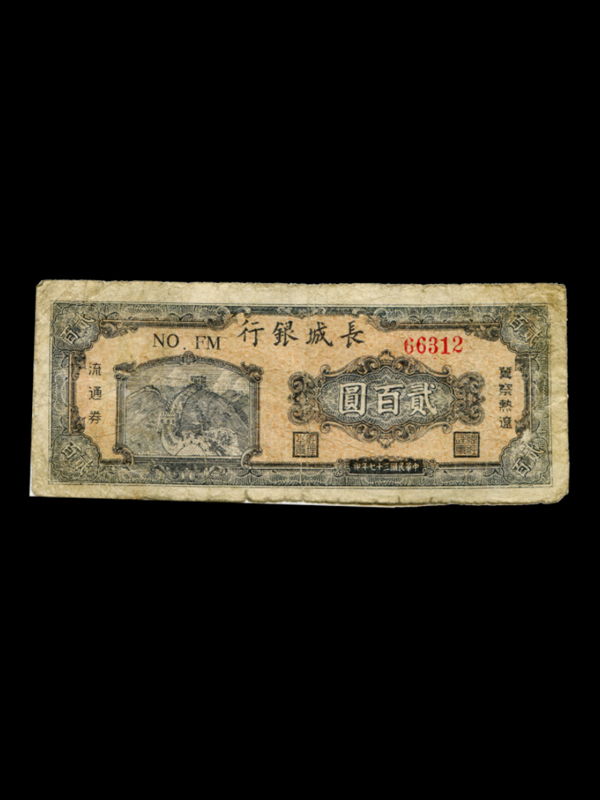 正面:蓝色;票面上方为行名及票号;左部为长城图案;右部为面额“贰佰圆”,面额下方为总经理章、经理之章的方印;票面左右两侧印有“冀察热辽”、“流通券”字样;票面下方为印制时间“中华民国三十七年印”字样;四角印有面额 “贰佰”。背面红色,英文字样,上方为行名,中部印及四角印有英文面额和数字面额“200”。