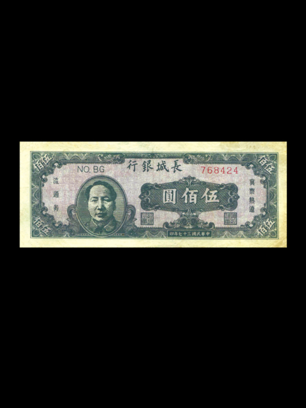 正面:蓝色;票面上方为行名及票号;左部为毛泽东头像图案;右部为面额“伍佰圆”,面额下方为总经理章、经理之章的方印;票面左右两侧印有“冀察热辽”、“流通券”字样;票面下方为印制时间“中华民国三十七年印”字样;四角印有面额 “伍佰”。背面红色,英文字样,上方为行名,中部为长城图案,中下、两端及四角印有英文面额和数字面额“500”;最下方为印制时间“1948”。
