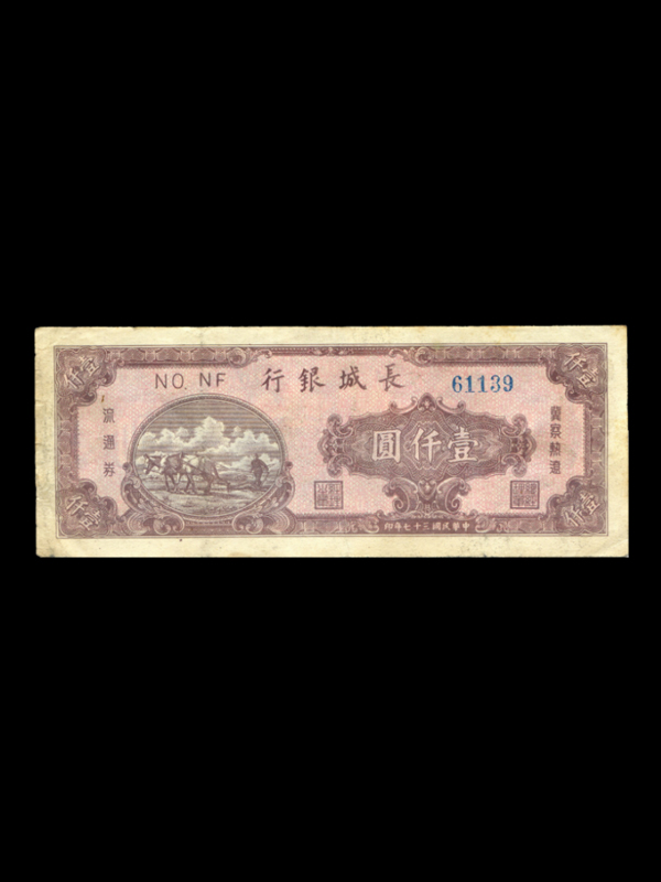 正面:红棕色;票面上方为行名及票号;左部为二马拉犁图案;右部为面额“壹仟圆”,面额下方为总经理章、经理之章的方印;票面左右两侧印有“冀察热辽”、“流通券”字样;票面下方为印制时间“中华民国三十七年印”字样;四角印有面额 “壹仟”。背面蓝紫色,英文字样,上方为行名,中部为长城图案,中下、两端印有英文面额和数字面额“1000”;最下方为印制时间“1948”。