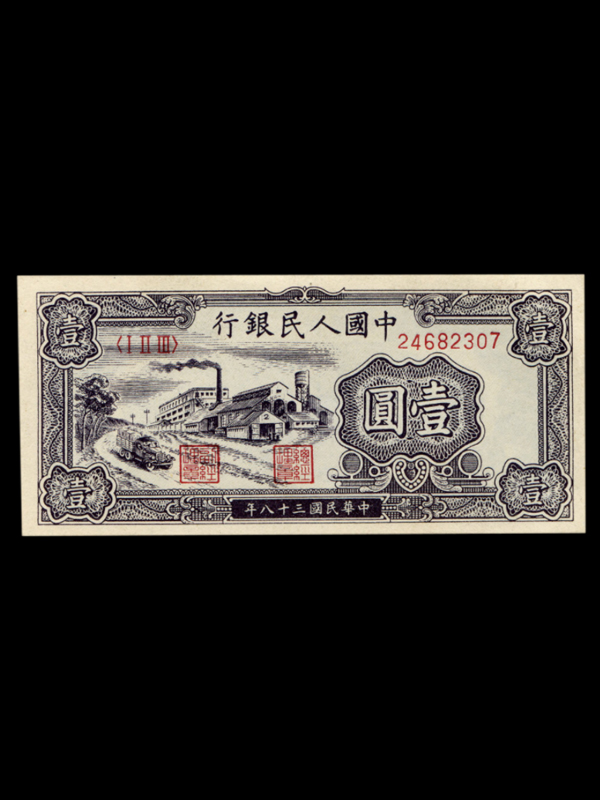 【名称】第一套人民币壹圆工厂【发行时间】1949年8月【停用时间】1955年5月10日【面值】1元【票面尺寸】116x56mm【字冠、号码】三字冠、八号码【图案及颜色】正面左侧工厂和汽车主蓝灰色背面花球主灰色【印刷工艺】胶印三色【印刷单位】上海印钞厂【发行单位】中国人民银行【特点】1、无水印。2、底纹为曲纹。3、暗记:正面左侧靠边框的树梢上有【R】;左下花符与树根之间也有【R】;右侧面值下心形图形内有【中】;左侧粗树的树杈间有【人】;左侧房子墙上有【2】;行名右侧花卷中有【D】和【C】;背面年号左右有【Y】和【Q】。4、冠字只见【I、II、III】一种。