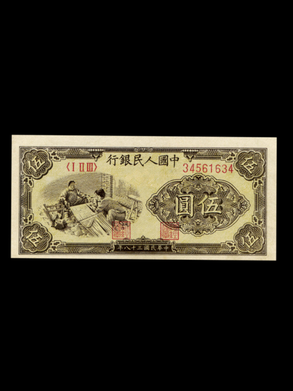 【名称】第一套人民币伍圆纺织【发行时间】1949年8月【停用时间】1955年5月10日【藏品面值】5元【票面尺寸】116 x56 mm【字冠、号码】三字冠、八号码【图案及颜色】正面左侧织布图主浅棕色 背面花符主茶色【印刷工艺】胶印三色【印刷单位】上海印钞厂【发行单位】中国人民银行【特点】1、有英文字母水印和无水印两种,水印者极少。2、有薄纸和厚纸之分,薄纸很少见。3、底纹由“伍”、“5”和曲纹组成。4、暗记:正面右侧面额下花心上有“中”;左图倒立凳腿旁有“中”;左图右侧凳子头上有“H”;背面右侧面值花符右上下方各有一“人”;背面行名上方花卷中有“上”和“☆”;左侧面值花符右上方有“民”;左侧面值左下角有“中”。5、冠字只见“I、II、III”一种。