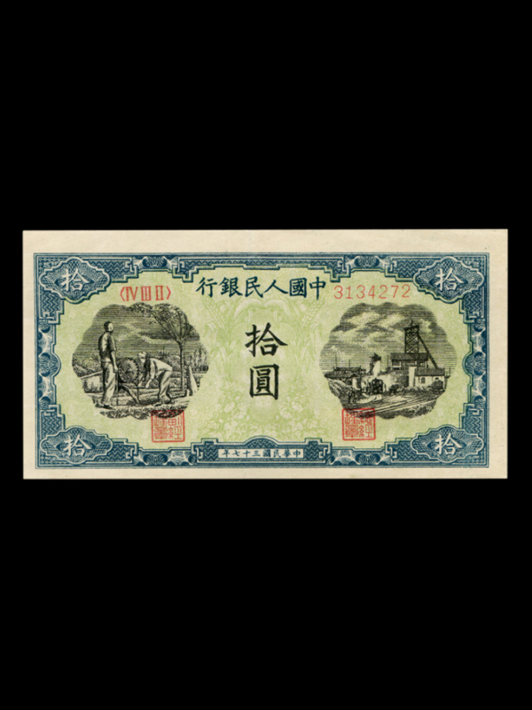 【名称】第一套人民币人民币灌田矿井拾元【发行时间】1948年12月1日【停用时间】1955年5月10日【面值】10元【票面尺寸】121x63mm【字冠、号码】三字冠、七号码【图案及颜色】正面左侧灌田右侧矿井图主深绿色背面花符主蓝绿色【印刷工艺】石印四色【印刷单位】第三印刷局【发行单位】中国人民银行【特点】1、无水印。2、底纹由【拾圆】和禾穗组成。3、暗记;正面左侧房子墙上有【W】;左图弯腰人腿后也有【W】;背面右侧面值下方有【E】;左侧面值右下方有【E】和【I】。4、第一套人民币人民币灌田矿井拾元是首批发行的票卷之一。5、纸张有厚薄,颜色有深浅之分。