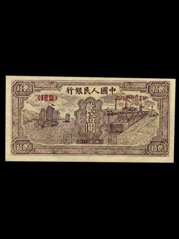 【名称】第一套人民币贰拾元帆船与火车【发行时间】1949年8月【停用时间】1955年5月10日【票面尺寸】121x63mm【字冠、号码】三字冠、无号码【印刷工艺】凸印四色