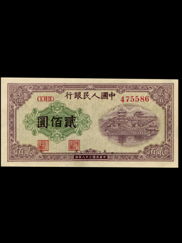 【名称】第一套人民币贰佰圆佛香阁(排云殿)【发行时间】1949年5月8日【停用时间】1955年5月10日【面值】200元【票面尺寸】135x70mm【字冠、号码】三字冠、六号码【图案及颜色】正面右侧颐和园和万寿山智慧海主子黄色背面花符主棕色【印刷工艺】胶印五色【印刷单位】东北银行造币厂【发行单位】中国人民银行【特点】1、空心水印和菱花水印两种。2、底纹由【贰佰】和花纹组成。3、暗记:正面右上角面额内有【解】;正面右下角面额内有【放】;正面年号花卷内有【全】;正面左下角面额内有【中】;正面左上角面额内有【国】;正面左侧面额左侧花卷内有【A】;正面行名行字右下有【日】;背面中央大花团左下角花卷内有【拥】;背面中央大花团右下角花卷内有【护】;背面左侧方框右花卷上有【毛】;背面右侧方框左端花卷上有【主】背面行名右侧花卷内有【席】。4、号码形体至少有粗壮体大字、粗壮体小字和细瘦体三种以上,平头3极少。5、面值【贰】字书写特别。