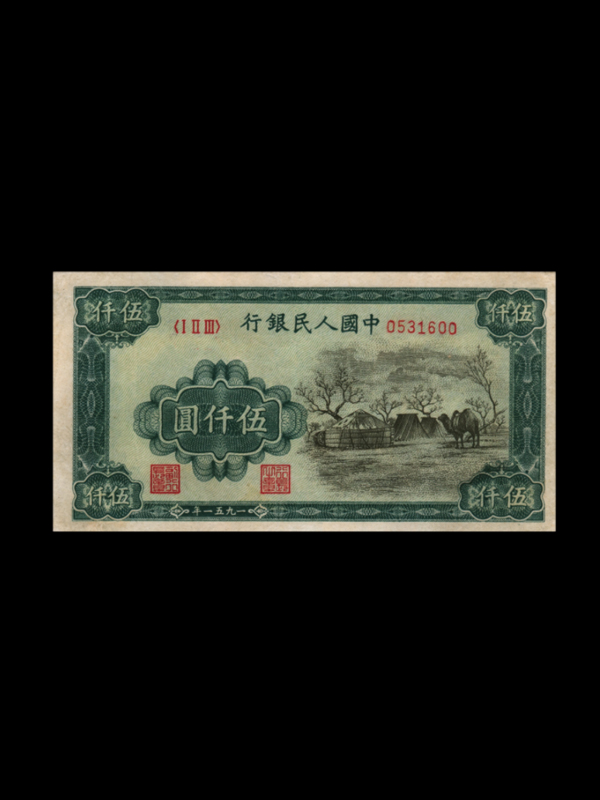 【名称】第一套人民币伍仟圆蒙古包【发行时间】1951年5月17日【停用时间】1955年5月10日【面值】5000元【票面尺寸】140x74mm【字冠、号码】三字冠、七号码【印刷工艺】胶印四色、凹印一色【图案及颜色】正面右侧有蒙古包和骆驼图案,主色为绿色;背面为花符及蒙文行名和面值,主色为蓝色。【票幅及边框尺寸】票幅140mmx74mm;正面边框为130mmx65mm。【印制时间及工艺】1951年5月由北京印钞厂印制;胶印五色。【发行单位】中国人民银行【特征】(1)无水印;(2)底纹由曲纹组成;(3)暗记:正面蒙古包上有【蒙古】;正面右下角花符上方有【0】;背面中心蒙文中有【人】和【5000";(4)背面印有蒙文行名和面值,在内蒙古地区发行,收藏界公认为第二大珍品;(5)冠字只见【ⅠⅡⅢ'’一种。1951年第一版人民币【伍仟圆蒙古包】发行于内蒙古地区,仅在城市使用,流用数量极少,当时人们普遍缺乏收藏意识,加之银行回收彻底,使得此枚存世甚少,收藏难度极大,甚为珍贵。