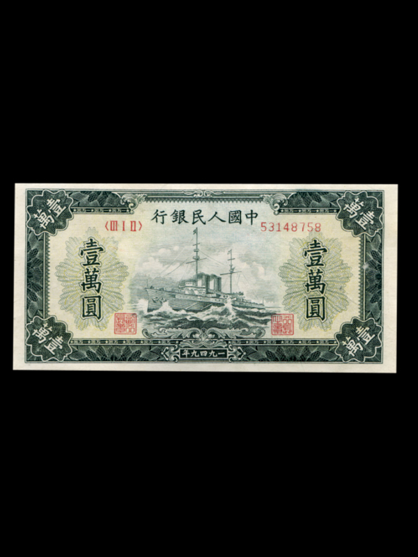 【名称】第一套人民币壹万圆军舰【类别】单张人民币【发行时间】1950年1月20日【停用时间】1955年4月1日【面值】10000元【票面尺寸】140x75mm【字冠、号码】三字冠、八号码【印刷工艺】凹凸印各一色、胶印一色【图案及颜色】正面中间军舰图主黄绿色、背面花符主茶色或橘红色【印刷单位】北京印钞厂【发行单位】中国人民银行【特征】1有菱花水印、星水印、无水印三种。2、底纹由【中国人民银行】和【壹万圆】组成。3、背面可分为茶色和橘红色,橘红色很少。4、暗记:正面行名左侧花饰中有【四】;正面行名右侧花饰中有【九】;正面年号左侧花卷中有【万】;正面年号右侧花卷中有【X】。