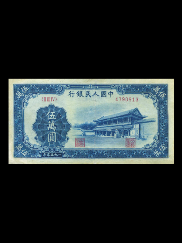 【名称】第一套人民币伍万圆新华门【发行时间】1953年12月【停用时间】1955年4月1日【面值】伍万圆【票面尺寸】140x75mm【字冠、号码】三字冠、七号码【印刷工艺】凹印二色、胶印二色【图案及颜色】正面右侧为新华门图,主色为蓝绿色;背面中间为拖拉机,主色为绿色。【票幅及边框尺寸】票幅140mmx75mm正面边框为129.5mmx65mrn。【印制时间及工艺】1950年4月27日至1950年8月31日胶凹印各二色。【印刷单位】北京印钞厂【发行单位】中国人民银行【特征】1、有菱花水印;2、无底纹;3、暗记:正面左侧大花符左下花卷间有【人民】;正面左下角万字上有【中】;正面新华门石狮下有【人】、【工】;正面新华门右下树中有【民】;正面右下角万字上有【中】;背面中心拖拉机左下有【民】;背面行名左下花卷中有【5】;4、是最大面额票券之一,较珍稀;5、是发行时间最晚、流通时间最短的票券之—。