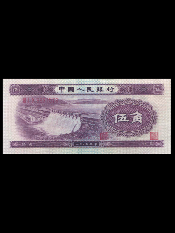【名称】第二套人民币伍角水电站无水印【发行时间】1955年3月1日【停用时间】1999年1月1日【发行量】限量【面值】5角【字冠字号】三冠七位号【正面图案】小丰满水电站主紫色【背面图案】花符、国徽、汉、蒙、维、藏文字主紫黄色【票面尺寸】125x57.5mm【印刷工艺】胶印七色、凹印一色【印刷单位】北京印钞厂【发行单位】中国人民银行【特征】1、无水印水印2、未发现暗记。3、是第二套人民币中存世最多的票卷。4、近年市场见到一种正面为红色的五角卷,价格略高于普通卷,是人为用化学方法改制。