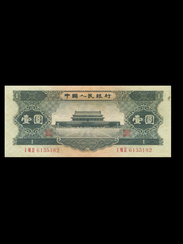 【藏品名称】第二套人民币1元天安门【藏品类别】人民币单张【发行时间】1961年3月25日【停用时间】1973年8月15日【发行数量】限量【藏品面值】1元【字冠字号】三字冠、七号码【正面图案】天安门主蓝黑色【背面图案】花符、国徽及汉、蒙、维、藏文字主蓝黑色【票面尺寸】150 x67.5 mm【印刷工艺】胶印八色、凹印二色【印刷单位】北京印钞厂【发行单位】中国人民银行【特点】1、空心五角星水印。2、天安门上8个宫灯换成了两条标语口号,正背面花纹也进行了修改。3、年版号改成“1956”。4、未发现暗记。