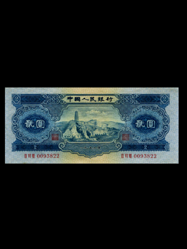 【名称】第二套人民币2元宝塔山【发行时间】1955年3月1日【停用时间】1976年12月【发行量】限量【面值】2元【票面尺寸】155x70mm【字冠、号码】三字冠、七号码【印刷工艺】胶印四色、凹印二色【正面图案】延安宝塔山主蓝色【背面图案】花符、国徽及汉、蒙、维、藏文字主蓝黄色【印刷单位】上海印钞厂【发行单位】中国人民银行【特点】1、实星五角星花纹混合水印。2、暗记:正面行名左下有【3】;左侧山坡上有【2】;背面右侧花符左上有【中】;中字左方有【人】;左数第三个台阶左上有【民】。3、背面延安宝塔山。延安宝塔山古称嘉岭山,位于延安城东南,延河之滨。在山上可鸟瞰延安整个城区。因山上有塔,通常称作宝塔山。山高1135.5米,山上宝塔始建于唐,现为明代建筑。平面八角形,九层,高约44米,楼阁式砖塔。宝塔山是革命圣地延安的重要标志和象征,【只有登上宝塔山,才算真正到了延安】。