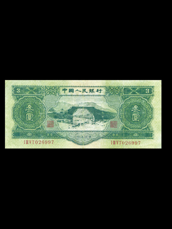 【名称】第二套人民币53年叁圆井冈山【发行时间】1955年3月1日【停用时间】1964年5月15日【发行量】限量【面值】3元【票面尺寸】160x72.5mm【字冠、号码】三字冠、七号码【印刷工艺】胶印四色、凹印二色【正面图案】井冈山龙源口图主深绿色【背面图案】花符国徽汉、蒙、维、藏四种文字行名和面值主深绿色【印刷单位】苏联代印【发行单位】中国人民银行【特点】1、实心五角星花纹混合水印。2、未发现暗记。3、是人民币发行史上唯一一枚三元面额票劵,由周总理指定。4、由苏联代印,珍惜。价值藏点:3元纸币属第二套人民币,前后共使用了9年,是为纪念井冈山革命根据地周总理指定印刷发行的,由苏联代印。是借鉴当时苏联的卢布常用【三】的面额。此版币是中国唯一的一枚三元面额纸币。目前存世量甚少,收藏市场叫价数千元。一般市场里常能看见的,是经过粘贴修补的旧币,没多少实际收藏价值。由于全国人民对周总理有着独特的情怀,基本有此张纸币的收藏者都不愿意出手,以纪念周总理。使得此币市场非常稀有。