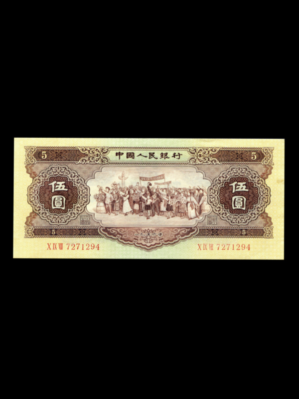 【藏品名称】第二套人民币5元海鸥水印(实心五角星花纹混合水印)【藏品类别】人民币单张【发行时间】1962年4月20日【停用时间】1983年12月1日开始只收不付,1999年1月1日停用【发行数量】限量【藏品面值】5元【字冠字号】三冠字 七位号【正面图案】各族人民团结图【背面图案】花符、国徽及汉、蒙、维、藏文字,主棕色【票面尺寸】165x 75mm【印刷工艺】胶印九色、凹印二色【印刷单位】1960年8月开始由北京印钞厂印刷【发行单位】中国人民银行【特点】1、实心五角星花纹混合水印。有的也称海鸥水印。2、暗记:正面华表下穿白衣服人左手下有“人”;左侧花饰左下有“五”;右侧花饰右下有“六”;背面左侧花符下方有“六”;左侧花符下方有“工”。3、年版号改成“1956”,正背面花符也进行了修改。4、是第二套人民币中发行最晚的票劵。