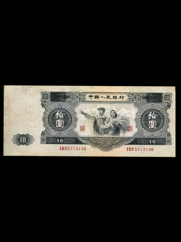 【名称】第二套人民币10元工农像【发行时间】1957年12月1日【停用时间】1964年4月15日【票面尺寸】210x85mm【字冠、号码】三字冠、七号码【印刷工艺】胶印四色、凹凸印各二色【正面图案】工农联盟图主黑色【背面图案】花符、国徽及汉、蒙、维、藏文字主黑色【印刷单位】开始苏联代印【发行单位】中国人民银行【特点】1、正面左侧国徽固定水印。2、是人民币发行史上最大票幅的票劵。3、四周尤其左边有较宽的白边,俗称【大白边】。4、未发现暗记。5、由苏联代印,极珍贵。