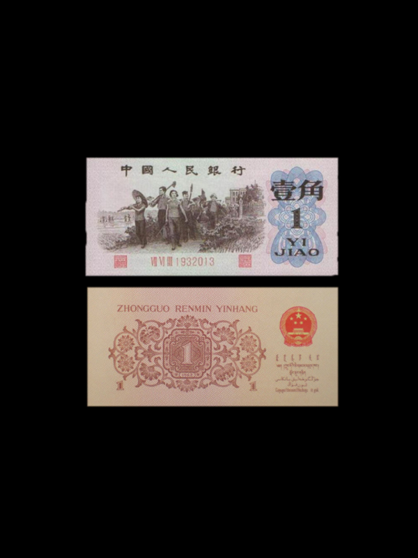 【名称】第三套人民币1角【发行时间】1967年12月15日【停用时间】2000年7月1日【藏品面值】1角【字冠字号】三冠 七号码【正面图案】教育与生产相结合图【票面尺寸】105x 50mm【印刷工艺】凹印【发行单位】中国人民银行【特点】1、红蓝三冠七位号码。2、空心五角星水印。3、暗记:正面大门右侧第六与第七栏杆上方有“A”;在“A”的左上方有“J”,下方有“十”。4、背面印有“1962”年号。