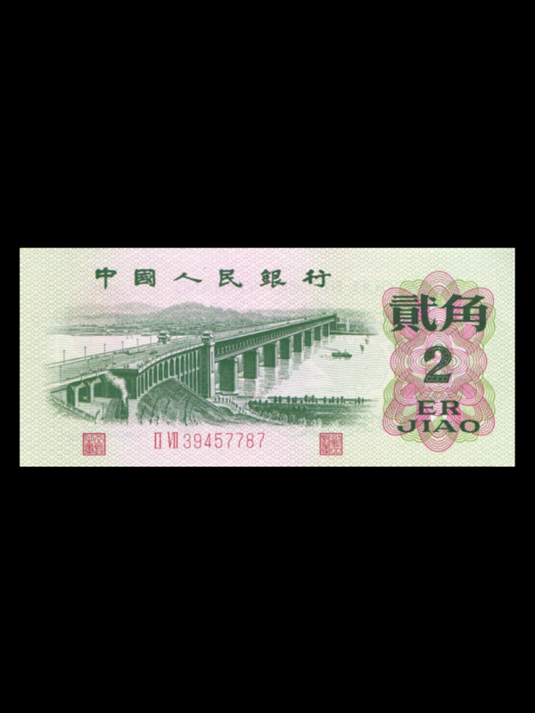【名称】第三套人民币2角【发行时间】1964年4月15日【停止时间】1992年月2月4日开始只收不付 2000年7月1日停用【藏品面值】2角【字冠字号】二字冠 八号字【正面图案】武汉长江大桥【背面图案】国徽 牡丹花【印刷工艺】胶版印制【票面尺寸】110x50mm【发行单位】中国人民银行【特点】1、二冠八位号码。2、无水印。3、暗记:正面大桥左桥头坡地上,有数字“2”暗记。4、背面印有“1962”年号。5、2角劵汉字“角”的尾巴没有穿出来,这只是当时常用及惯用的写法,在第二套,第三套纸币中的所有角券都是这种写法。6、第三套人民币2角二字冠只有胶版一种。第三版人民币现在已全部退出流通市场。国家已回收销毁。市面很少见。整刀的更是难得一见。是收藏家投资和收藏的不错选择。