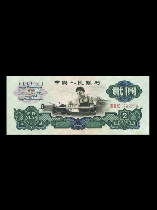 【名称】第三套人民币2元【发行时间】1964年4月15日【停止时间】1992年月2月4日开始只收不付 1991年3月1日停用【面值】2元【字冠字号】三字冠 七号字【正面图案】车窗工人生产图【背面图案】石油矿井【印刷工艺】正背面凹印【票面尺寸】135mx57mm【发行单位】中国人民银行【特征】1、水印有五角星水印和布币水印两种。2、为三冠字七位号码。3、暗记:背面左下树丛中有“2”和“R”。4、正背面均有“1960”年号。5、钞纸有五角星水印和布币水印两种;三字冠7位数号码,正面为车床工人图,象征工业为主导。