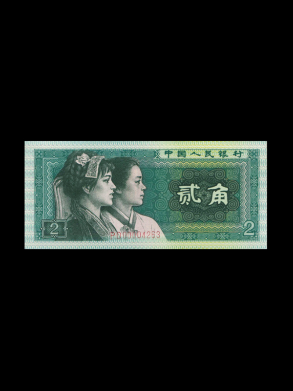 【名称】1980年版贰角民族人物头像【发行时间】1988年5月10日【票面尺寸】120×55mm【正面图案】朝鲜族、布依族人物头像,正面是土家族姑娘(黄其萍)和朝鲜族姑娘(苏春熙)头像【印刷工艺】正背面胶印【水印】无水印【冠号】二字冠、八号码,红色冠号。