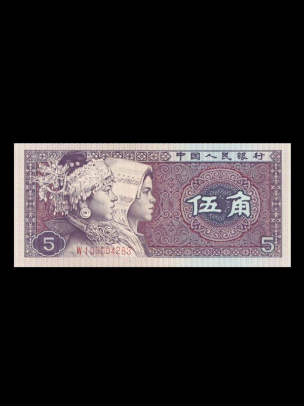 【名称】1980年版伍角民族人物头像【发行时间】1987年4月27日【票面尺寸】长125毫米宽58毫米【正面图案】苗族、壮族人物头像【印刷工艺】正背面胶印;【水印】无水印;【冠号】二字冠、八号码,红色冠号。