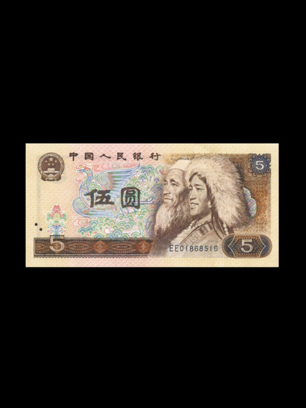 【名称】1980年版伍圆民族人物头像【发行时间】1988年9月22日【票面尺寸】150×70mm【正面图案】正面是藏族和回族男子的头像,左侧是【仙鹤劲松】图。仙鹤在古代是【一鸟之下,万鸟之上】,仅次于凤凰的【一品鸟】,明清一品官吏的官服编织的图案就是【仙鹤】。鹤又喻为贤能之意,古代招贤诏书称为【鹤板】。劲松挺拔,不畏严寒,是坚贞不屈之象征。松鹤组合,又寓意健康长寿。【背面图案】币背图案是【长江巫峡】壮观。巫峡全长45公里,从重庆巫山县之大宁河口,到湖北巴东县官渡口。船行其间,两岸青山连绵,群峰如屏。时而大山挡前,时而峰回路转,著名的巫峡12峰中最诱人为神女峰,亭亭玉立,令人神往。【印刷工艺】正背面凹印;【水印】方圆古钱币四方连续水印;【冠号】二字冠、八号码,黑色冠号。