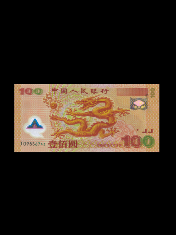 【藏品名称】迎接新世纪纪念钞(千禧龙钞)【类 别】单张【发行时间】2000年11月28日【发行单位】中国人民银行【面 值】100元【颜 色】橘色【尺 寸】165x80mm【材 质】塑料基片【发 行 量】1000万 2000年11月28日,中国人民银行发行了我国首枚塑钞——“迎接新世纪”纪念钞。正面以北京北海公园九龙壁上“大升龙”为设计依据,雄姿矫健,威严无比,从大海中腾空而起,张开百川大口,直视左侧熊熊燃烧的“火球”,如同为迎接新千年到来而跳起了吉祥舞蹈。背面主景图案为迎接新世纪的代表性建筑——“中华世纪坛”。从外观设计上来讲,体现了中华五千年文明的精髓,从内在来讲,“龙”是中华民族的象征,中国人民是龙的传人,在千禧年到来之际,发行以龙为主题的纪念钞,展现了我国政治稳定、民族团结和社会进步的现实,对增强我国各民族人民的凝聚力和向心力有着重要意义。