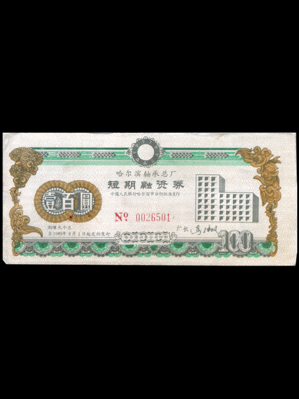 1989年哈尔滨轴承总厂短期融资券(100元)