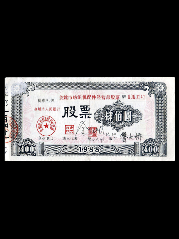 【1988年余姚市纺织机配件经营部股票(400元)】