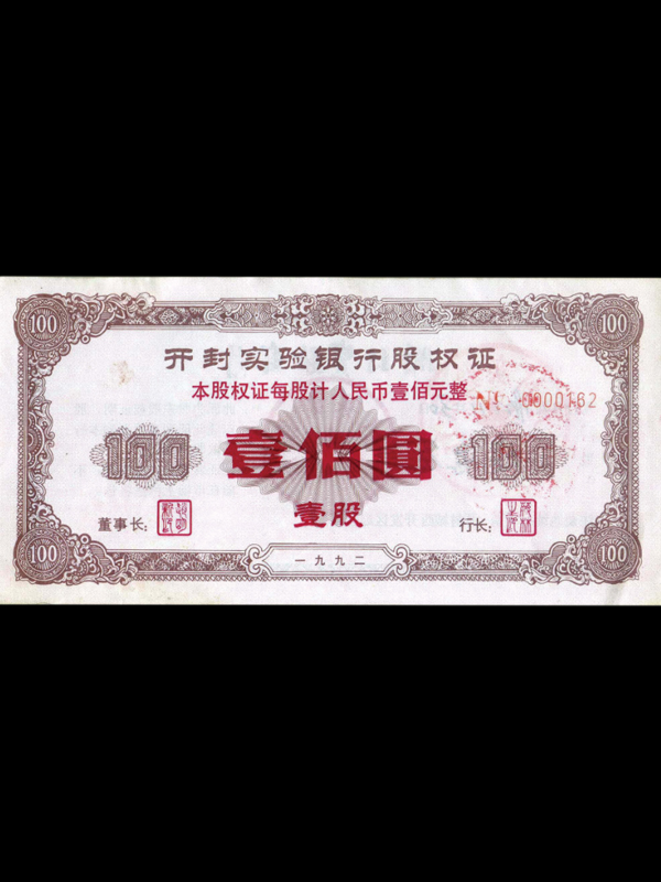 【1992年开封实验银行股权证(100元)】