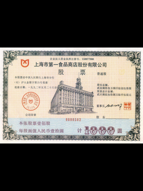 【1992年上海市第一食品商店股份有限公司股票(1000元)】