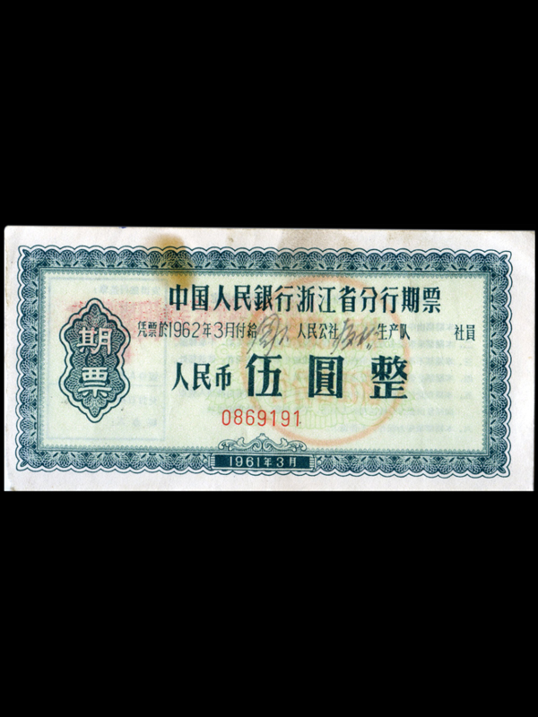 1961年中国人民银行浙江省分行期票(5元)