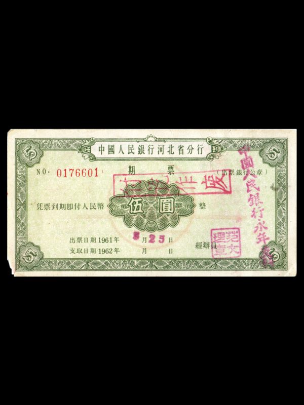 1961年中国人民银行河北省分行期票(5元)
