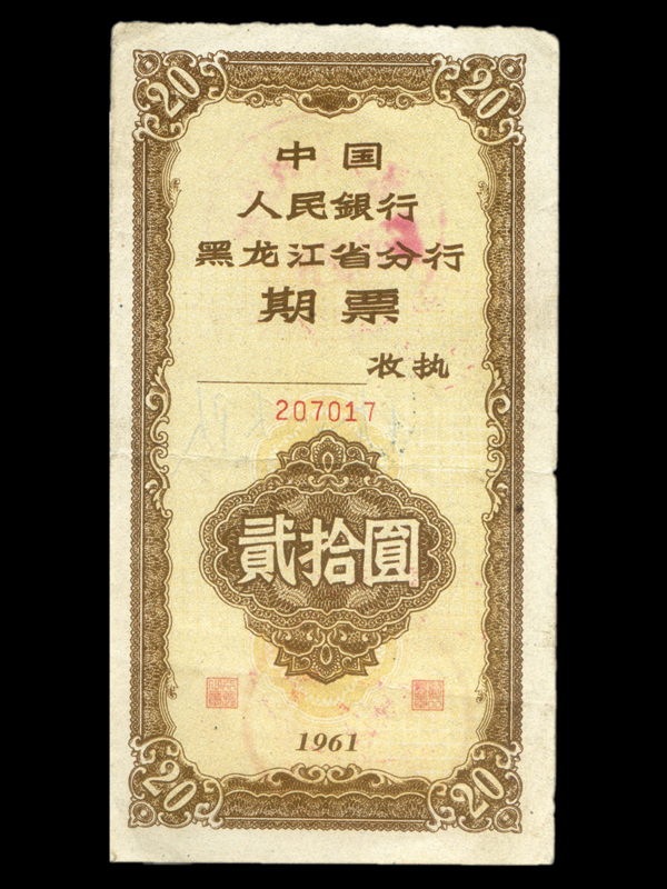 1961年中国人民银行黑龙江省分行期票(20元)