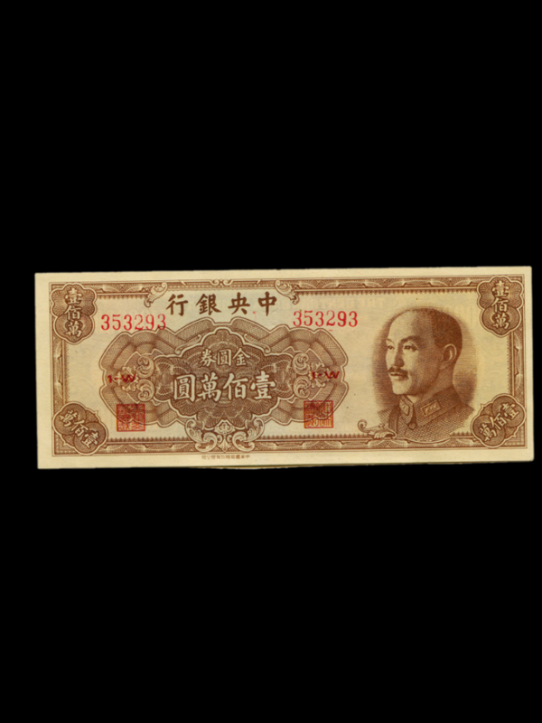 正面为黄褐色;票面上方为行名、票号;右部为蒋介石像图案,左部为面额【金圆券壹佰萬圆】及【中央银行总裁】、【中央银行副总裁】方印;下方为印刷单位【中央印制厂】;四角为汉字面额【壹佰萬】字样。背面黄褐色,英文字样,印有行名、面额、两个英文签名、印刷年份【1948】及广州海珠铁桥图案。