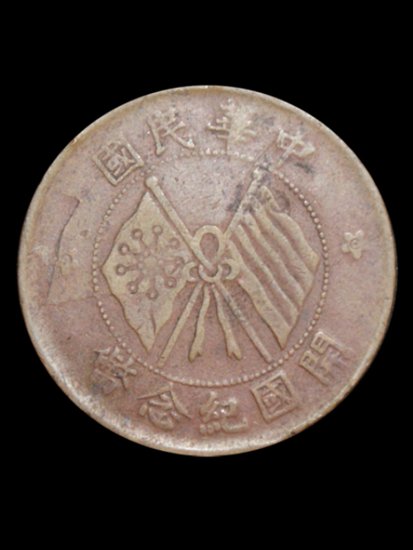正面有圈状图案将币面分为内外环,内环为铁血十八星旗及五色旗图案;外环上方“中华民国”字样,其中“民”字出头有黎民百姓出头寓意,下方为“开国纪念币”字样。背部圈状图案将币面分为内外环,内环为面额“十文”字样,下方映衬小麦及豆荚图案;外环为中华民国及现金的英文字样。