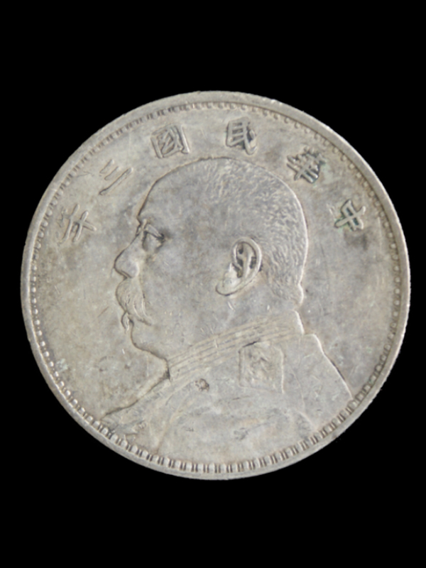 袁世凯像银币,俗称“袁大头”。正面为袁世凯像及铸造年份“中华民国三年”,背部面额“壹圆”下衬稻穗图案。直径39mm,重27.2克。
