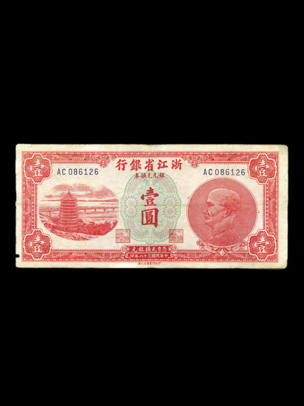 正面:红色。上方为行名,行名下有【银元辅币券】字样,左右印有票号;左部杭州钱塘江大桥及六和塔图案;中部自上至下分别印有面额、总经理章、【凭票兑换银元】字样、董事长章等;右侧为孙中山侧像图案;下方为印制时间【中华民国三十八年印】及印制单位【中央印制厂台北厂】;四角分别印有汉字【壹】字样。背面为红色,中部为帆船图案,左右印有董事长、总经理签名,四角印有面额【1】字样。