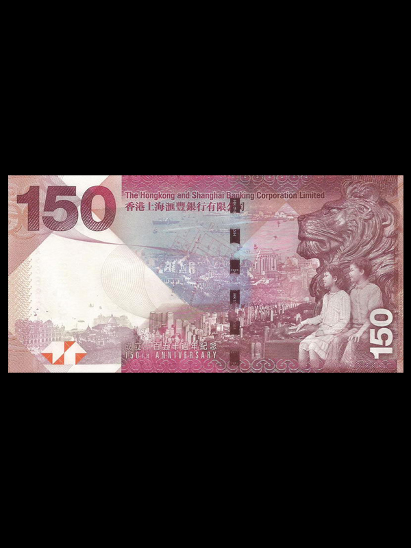 汇丰银行于2015年3月4日宣布发行200万张面值港币150元的纪念钞,以纪念在香港成立150年。 1865年3月3日成立,2015年为纪念汇丰成立150周年,由香港汇丰银行3月宣布特此发行纪念汇丰银行150周年纪念钞,限量发行200万张,共分为单钞、三连体和三十五连体三种类别。 香港汇丰银行150周年纪念钞的设计强调了汇丰与香港在过去150年来的密切关系,故采用了汇丰四座不同时期的总行大厦作为纪念钞的设计元素。当然,汇丰的一双铜狮子“史提芬”(左面的水印)和“施迪”(右面神态较闲适的狮子)亦是不可缺少要素之一。纪念钞的色调以宝石红为主,与汇丰钞票沿用颜色互相辉映,辅以寓意吉祥的金色。而纪念钞的大小,与2010年汇丰发行的港币500元钞票一样,再结合主要防伪特征,包括珠光图案、透光水印、荧光透视图案、变色开窗金属线等。