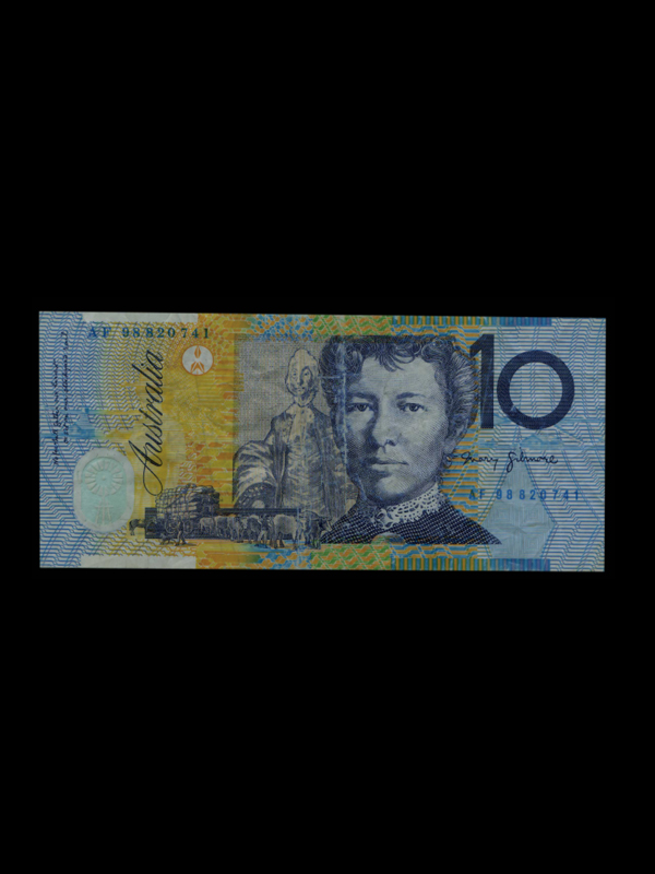 ◎正面:澳大利亚诗人帕特森。背景是一群奔腾的野马和英勇的骑士——这是在帕特森的长诗《雪河男子汉》中描述的景象。在右边面额数字【10】和透明窗之间是帕特森的签名,其肖像下方的左右两边是帕特森在他的的手迹——《雪河男子汉》。在肖像与面额数字之间的白色树叶和文字象征帕特森的另外一个著名短诗《马蒂尔达》。◎背面:澳大利亚诗人吉尔默女爵。背景是吉尔默女爵的作品中描述的场景——运送羊毛的马车队。背景是吉尔默女爵晚年肖像。在面额数字【10】和系列号之间是吉尔默的签名。最左边的手写体是吉尔默最著名的爱国诗篇《不许敌人抢夺我们的果实》